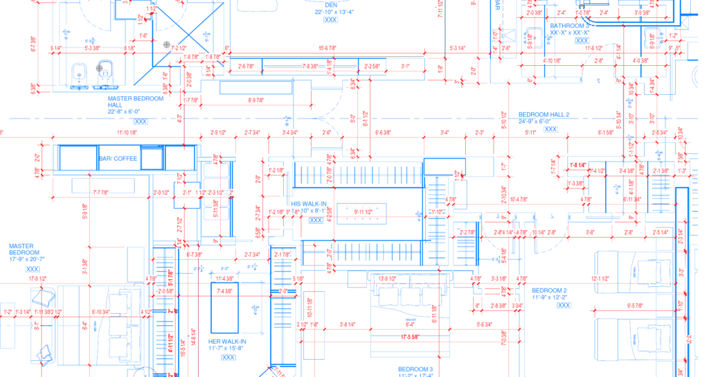We also provided field markup services to indicate the proposed room layouts including wall framing, door swings, countertops, and cabinetry using laser leveled floor tape marks for review of the design at a realistic scale.